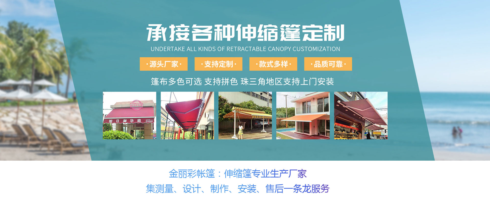 中山市金麗彩帳篷有限公司成立于2002年,是一家集遮陽篷配件生產、批發戶外休閑用品的專業彩蓬安裝制做工程公司,在廣東地區擁有大量彩樣板工程實例,公司技術力量成熟,專注承接定制制作安裝各種遮陽、遮雨、固定或活動蓬、展覽蓬、鋁合金無線遙控電動蓬、廣告蓬、歐式造型蓬、戶外休閑傘等產品。本公司還可以根據用戶需求制作各款大型戶外停車場帳蓬、款式新穎、質量可靠、價格實惠。公司位于中國廣東省中山市沙溪鎮,交通方便,物流快捷。金麗彩帳篷本著“客戶為先,誠信至上”的原則,熱誠歡迎各界朋友前來我司參觀、考察、洽談業務。